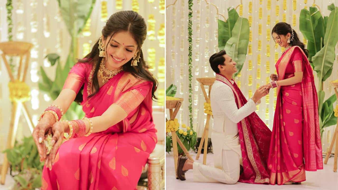 साखरपुड्यात रुमानीने गुलाबी रंगाची साडी नेसली होती. त्यावर साजेरे दागिने, हेअरस्टाइल आणि मेकअप.. असा तिचा सुंदर लूक होता. तर स्तववने कुर्ता पायजमा आणि त्यावर गुलाबी रंगाचा शॉल घेतला होता. गुडघ्यावर बसून त्याने रुमानीला अंगठी घातली.