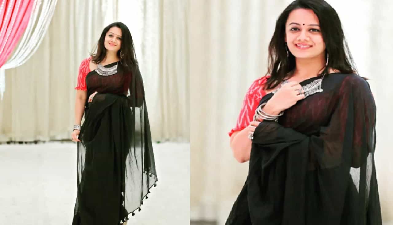 - स्पृहाने काळ्या रंगाच्या साडीला साजेशी ज्वेलरीही परिधान केली आहे. सिलव्हर रंगाच्या बांगड्या आणि त्याला साजेसा हार तिने घातला आहे. आणि प्लेन ब्लॅक साडीला सूट होणारा अबोली रंगाचा ब्लाऊज तिच्या सौंदर्यात भर घालतोय.