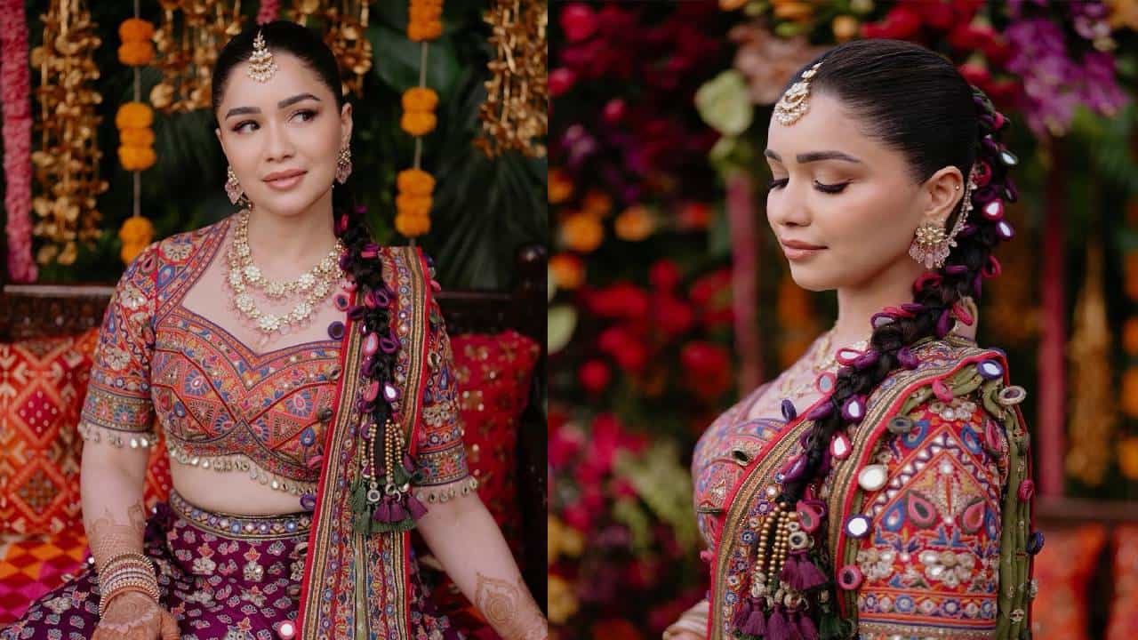 लग्नापूर्वीच्या मेहंदी आणि संगीत कार्यक्रमात साराने भरजरी मल्टीकलर लेहंगा परिधान केला होता. लेहंगा आणि ब्लाऊजवर काचेचं सुंदर वर्क करण्यात आलं आहे. पोशाखाला साजेशी अशी हेअरस्टाइल तिने केली आहे.