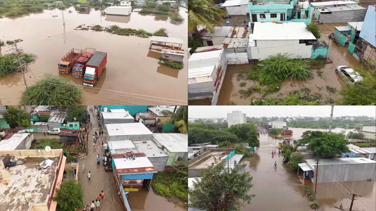 सोलापूर शहरातील शेळगी भागासह अनेक ठिकाणी नागरी वस्त्यांमध्ये पाणी साचल्याचे भयावह चित्र समोर आले आहे. ड्रोन कॅमेऱ्यातून टिपलेल्या या दृश्यांमध्ये पावसाचा हाहाकार स्पष्टपणे दिसत आहे. सोलापुरातील अनेक घरांमध्ये २ ते ३ फूट पाणी साचल्याने रात्रीच्या वेळी नागरिकांची मोठी तारांबळ उडाली.