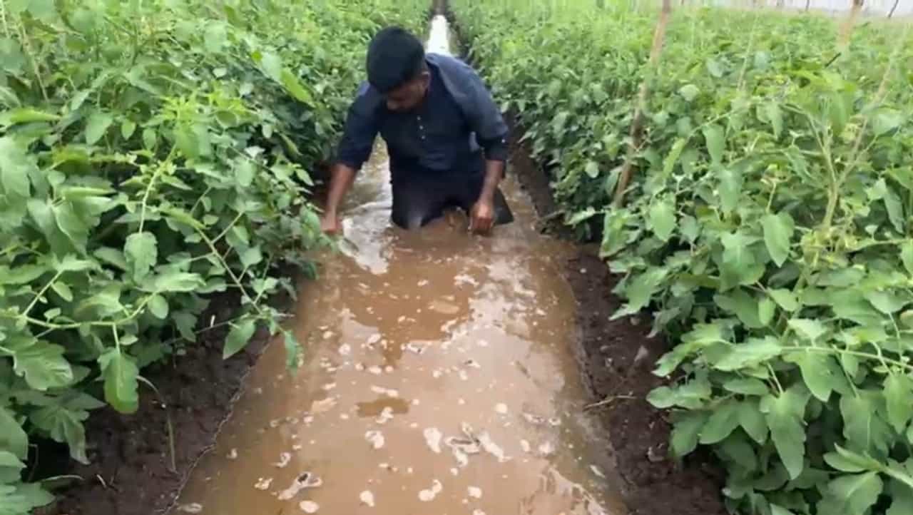 कालच्या मुसळधार पावसामुळे 2 एकरावरील टोमॅटो पिकाच्या बागेत पाणीच पाणी झाल्याने शेतकरी रडकुंडीला आला आहे.