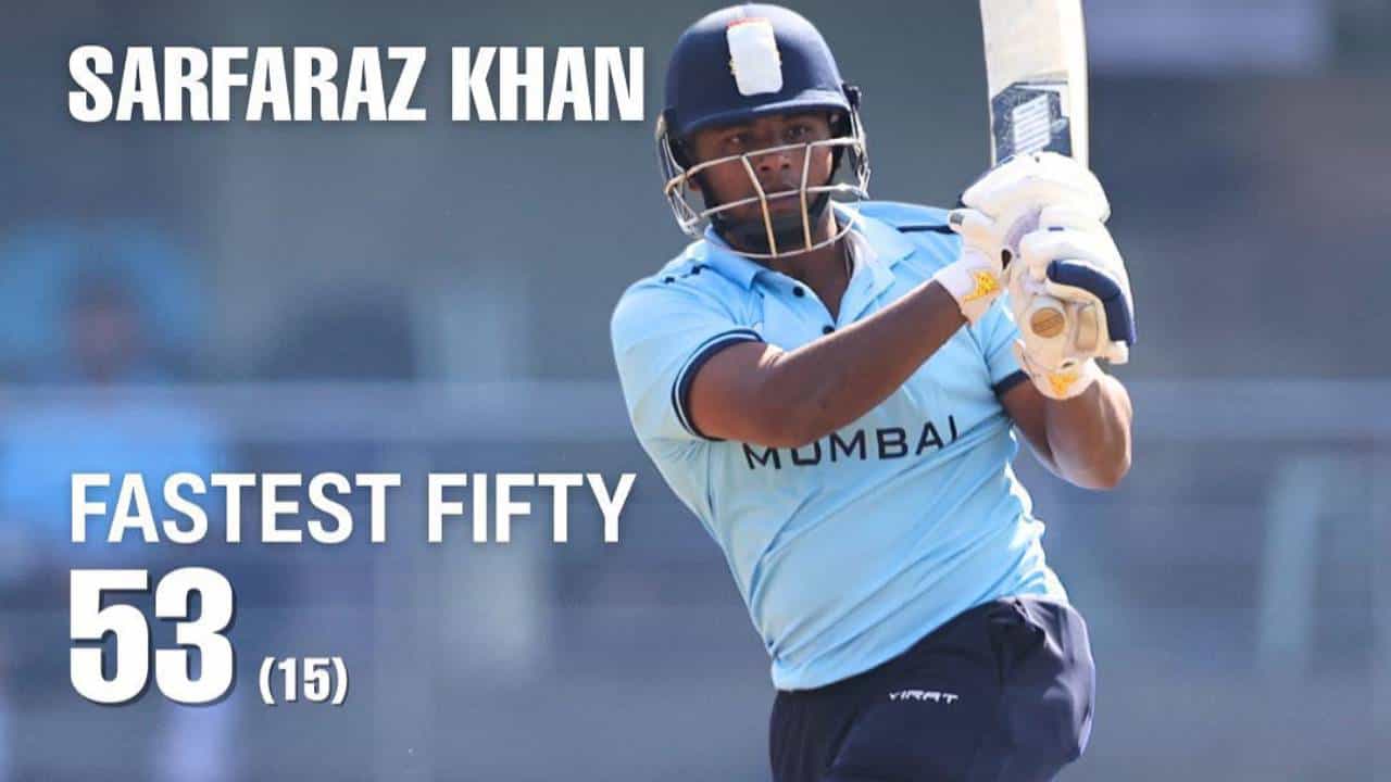 विजय हजारे ट्रॉफीमध्ये सरफराज खानने पंजाबविरुद्ध आक्रमक खेळी केली. त्याने फक्त 15 चेंडूत अर्धशतक ठोकत विक्रम केला. त्याने 20 चेंडूत 62 धावा केल्या, ज्यामध्ये एका षटकात 24 धावा होत्या.