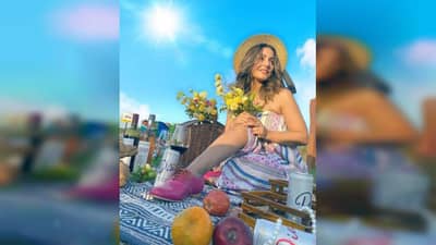 ट्रेंडी ड्रेस, डोक्यावर स्टायलिश हॅट, ट्रेंडी गॉगल आणि हातात वाईन हीनाचा हा लूक भूरळ पाडणारा आहे.