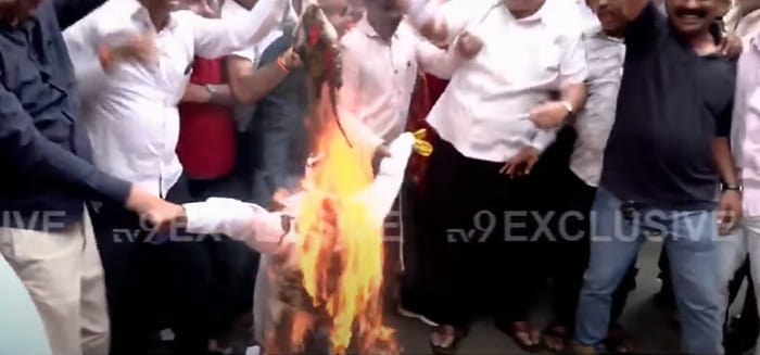 मुंबईच्या आझाद मैदानात ठाकरे गटाच्या नेतृत्त्वात हिंदी भाषा सक्तीचा विरोध करण्यासाठी राज्य सरकारच्या हिंदी सक्तीच्या जीआरची होळी करण्यात आली.