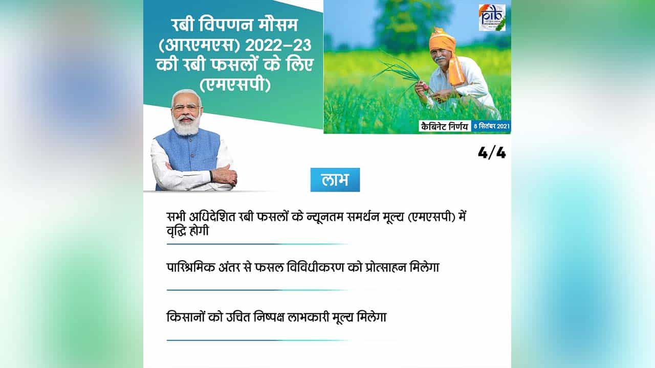 केंद्रीय मंत्रिमंडळाच्या बैठकीत घेतलेल्या निर्णयाची माहिती देताना केंद्रीय मंत्री पियुष गोयल आणि अनुराग ठाकूर यांनी रब्बी पिकांसाठी किमान आधारभूत किमतीत वाढ केल्याची माहिती दिली. केंद्रीय मंत्र्यांनी गव्हाच्या आधारभूत किमतीत 40 रुपयांनी, बार्लीच्या किमंत 35 रुपयांनी, हरभऱ्याने 130 रुपयांनी, मसूर आणि मोहरीने 400 रुपयांनी आणि सूर्यफूलच्या किमतीत 114 रुपयांनी वाढ केली आहे.