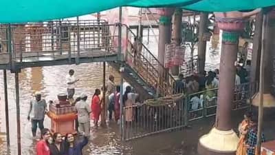दरवर्षी जुलै महिन्याच्या सुरुवातीस मंदिराच्या परिसरात पाणी येण्याची शक्यता असते. मात्र यंदा जून महिन्यातच मंदिरासमोरील पोर्चमध्ये पाणी आले आहे. धरणांतून विसर्ग वाढल्याने नदीची पाण्याची पातळी वाढली आहे.