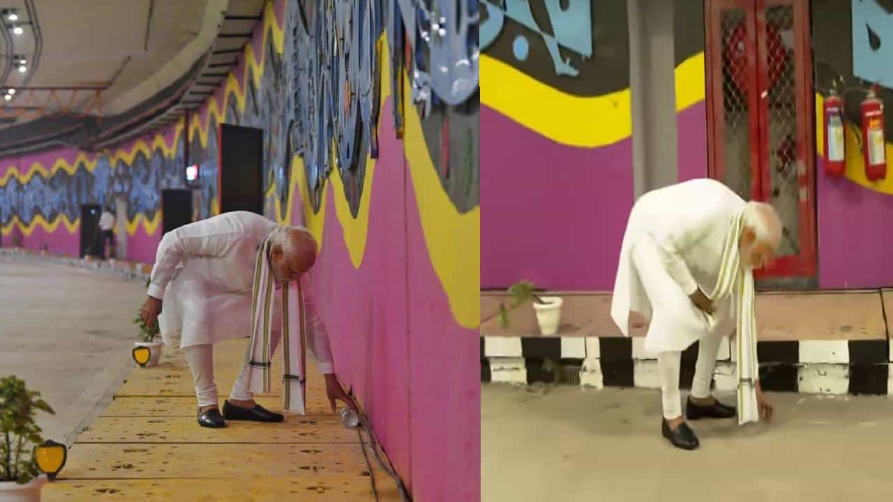 मध्य दिल्लीतील ITPO बोगद्याच्या पाहणीदरम्यान पीएम मोदी रस्त्यावर पडलेला कचरा उचलतात आणि पारंपारिक कलांच्या भित्तीचित्रासमोर डस्टबिनमध्ये टाकतात.