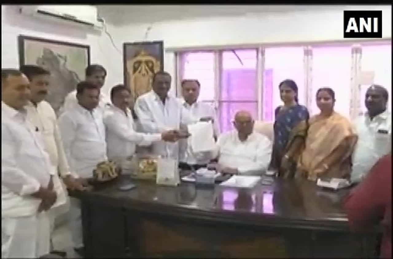 Hyderabad: 12 Congress MLAs met Telangana Assembly Speaker, Pocharam Srinivas Reddy and gave him a representation to merge the Congress Legislature Party with the ruling Telangana Rashtra Samithi. pic.twitter.com/oex4TZpZ8i
