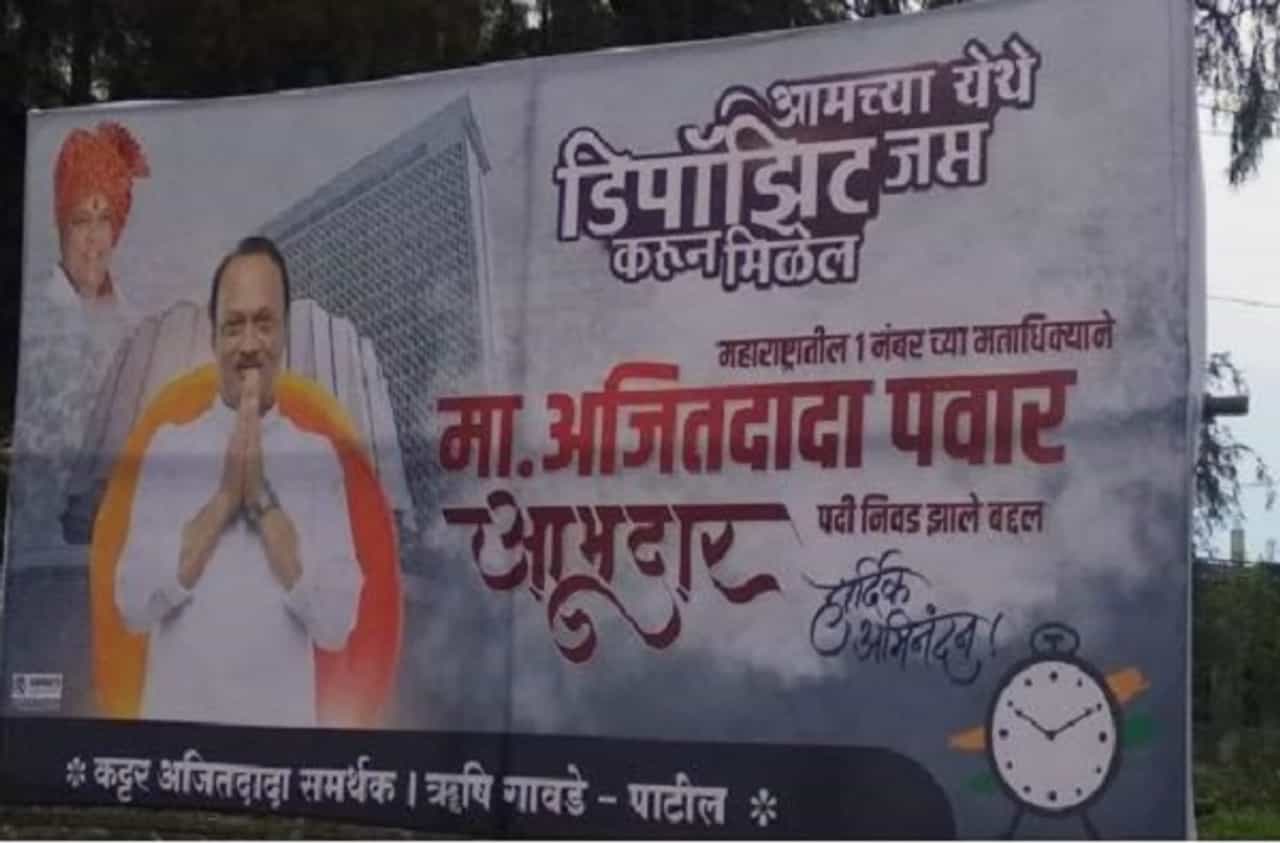 बारामतीत शरद पवार यांच्या 'गोविंदबाग' या निवासस्थानाजवळच 'आमच्या येथे डिपॉझिट जप्त करुन मिळेल' असा मजकूर असलेला अजित पवार यांचं अभिनंदन करणारा फलक लावण्यात आला आहे.