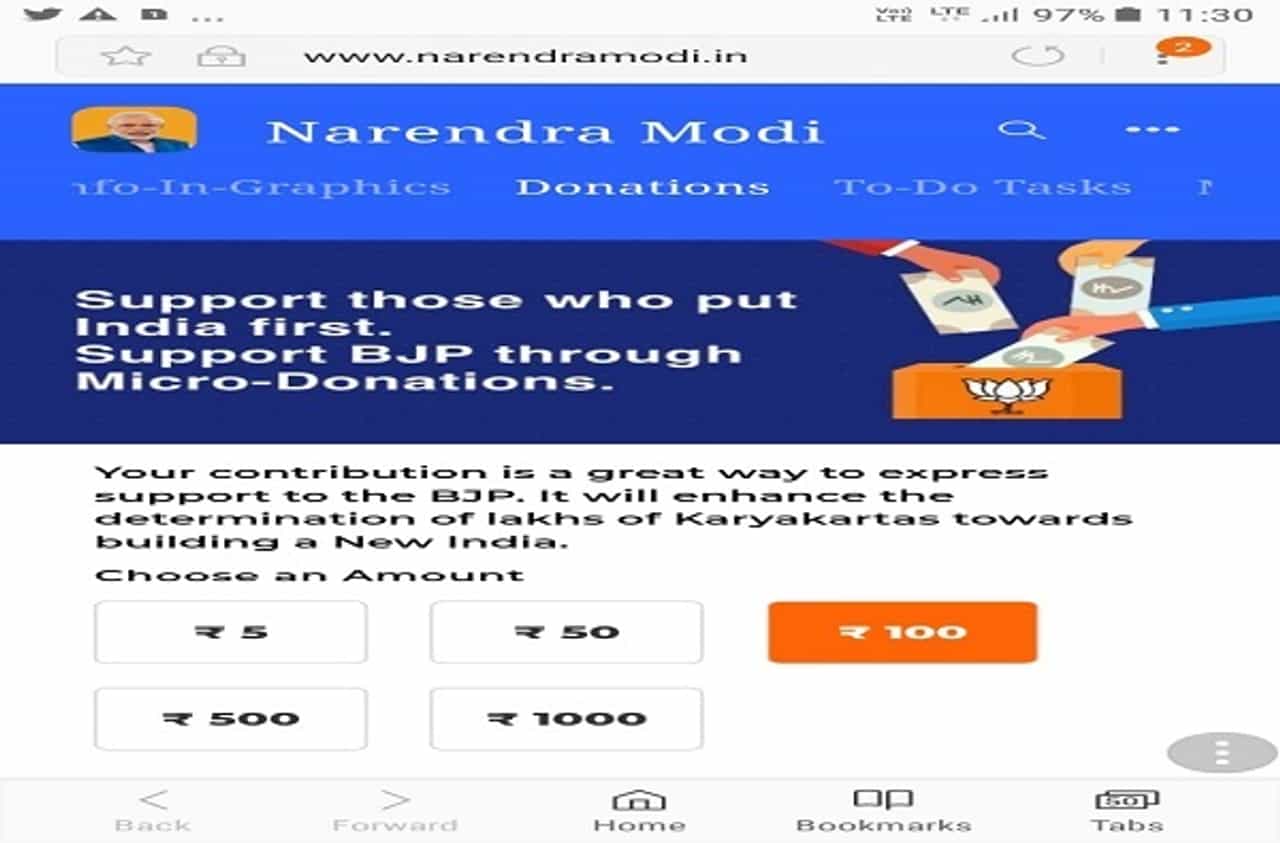 पंतप्रधान नरेंद्र मोदी यांना पुन्हा पंतप्रधान करण्यासाठी योगदान द्या असाही संदेश या माध्यमातून देण्यात आला आहे. पंतप्रधान नरेंद्र मोदी यांची वेबसाईट narendramodi.in याद्वारे हा फंड जमा केला जात आहे. निधी देण्यासाठी तुम्हाला मेसेज पाठवला जातो. त्यामध्ये पंतप्रधानांच्या वेबसाईटची लिंक दिली जाते. या वेबसाईटवर जाऊन लॉग इन करावं लागतं. मग डिटेल्स भरुन पैसे पाठवल्यानंतर तुम्हाला पैसे जमा झाल्याची पावती मेल केली जाते. राजकीय पक्षाला दिलेला निधी हा टॅक्स फ्री आहे.