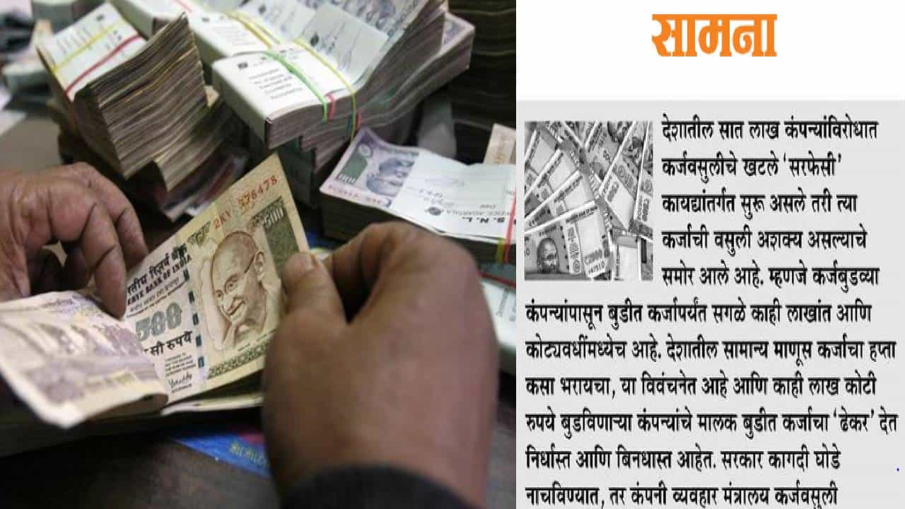 समोर आलेल्या माहितीनुसार, ०७ लाख कंपन्यांकडील कोट्यवधी रुपयांचं थकीत कर्ज असून ते वसूल होण्याची शक्यता फाक कमी आहे. या कर्जवसुलीसाठीचा सरफेसी कायदा मोदी सरकार आल्यानंतर कडक वगैरे करण्यात आला. थकीत कर्जासाठीची तारण ठेवलेली मालमत्ता जप्त करण्याचा अधिकार कर्ज देणाऱ्या संस्था आणि बँकांना मिळाला. मात्र बँका आणि वित्तीय संस्थांसाठी हे फायद्याचे झाले. पण कर्जवसुली भोपळाच होणार असेल तर या कठोर वगैरे कायद्याचा उपयोग काय, असा सवाल सामनातून विचारण्यात आला आहे