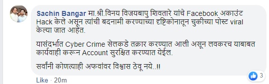 यासंदर्भात Cyber Crime सेलकडे तक्रार करण्यात आली असून लवकरच याबाबत कार्यवाही करून Account सुरक्षित करण्यात येईल. सर्वांनी कोणत्याही अफवांवर विश्वास ठेवू नये..!!, असे आवाहन सचिन बांगर यांनी केलं आहे. (Vijay Shivtare Son Vinay Shivtare Facebook Account Hack)