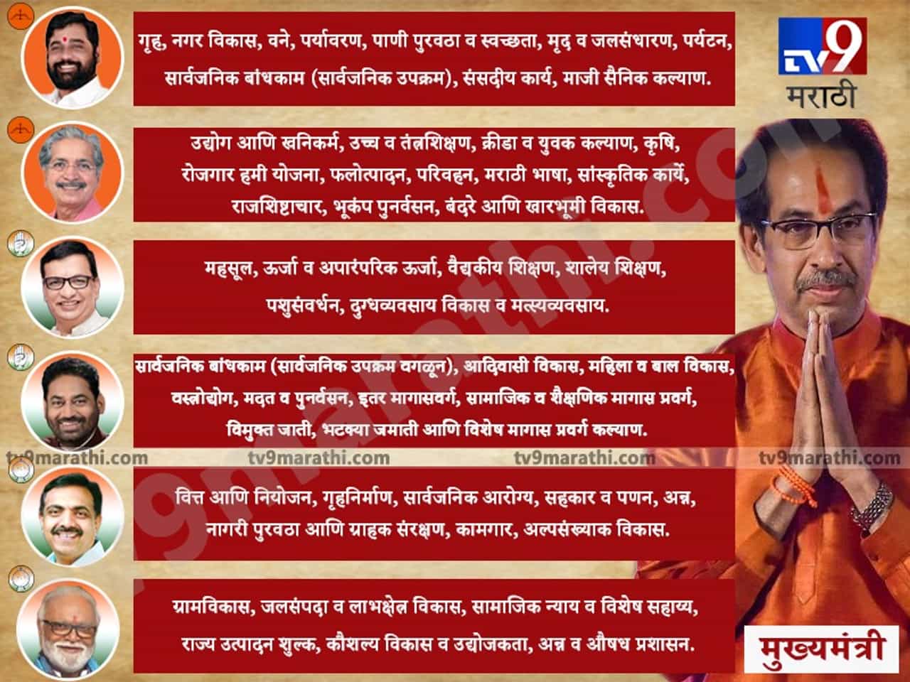 शिवसेनेकडील महत्त्वाची खाती – मुख्यमंत्री, गृह, नगरविकास, उद्योग, कृषी, क्रीडा आणि परिवहन, सार्वजनिक बांधकाम