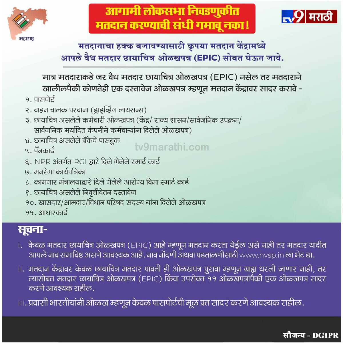 - मतदान केंद्रावर मतदान पावती ओळखपत्रासोबत वरील दिलेल्या ओळखपत्रांपैकी एक ओळखपत्र असणे गरजेचे आहे.