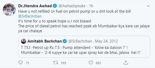 “तुम्ही पेट्रोल पंपावर इंधन भरले नाही की तुम्ही बिलाकडे पाहत नाही? आता तुम्ही बोलण्याची वेळ आली आहे. मी आशा करतो तुम्ही पक्षपाती नसाल. पेट्रोल-डिझेलचे दर पुन्हा गगनाला भिडले आहेत. मुंबईकरांनी आता कार जाळावी की चालवावी?” असा सवाल आव्हाडांनी अमिताभ बच्चन यांच्या जुन्या ट्वीटला ‘कोट-रीट्वीट’ करत विचारला आहे.