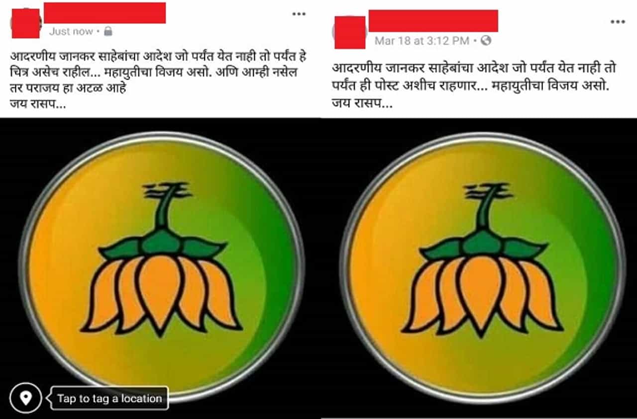 राष्ट्रीय समाज पक्षाच्या प्रमुख पदाधिकाऱ्यांनी आपल्या फेसबुक आणि व्हाट्सअॅप प्रोफाईलवर उलटे कमळ हे चिन्ह लावले आहे. जोपर्यंत मंत्री महादेव जानकर यांचा आदेश येणार नाही, तोपर्यंत महाराष्ट्रातल्या सर्व रासपच्या कार्यकर्त्यांनी पदाधिकाऱ्यांनी आपल्या व्हॉट्सअॅप आणि फेसबुक प्रोफाईलवर भारतीय जनता पक्षाचे कमळ चिन्ह हे उलटे लावणार आहेत.