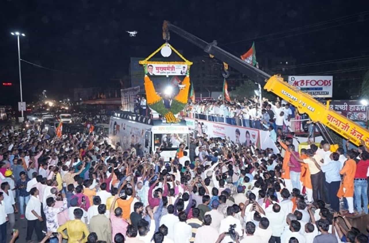 अनेक ठिकाणी मुख्यमंत्र्यांच्या विजय घोषणा दिल्या जात होत्या. त्याचबरोबर फुलांचा वर्षाव केला जात होता. मुख्यमंत्रीही उपस्थित कार्यकर्त्यांना आणि नागरिकांना अभिवादन करत होते. रस्त्यावर सर्वत्र भाजपाचे झेंडे लागल्याने शहर भाजपमय झालं होतं. महाजनादेश यात्रेची दृश्य कैद करण्यासाठी कार्यकर्त्यांची झुंबड उडाली होती.