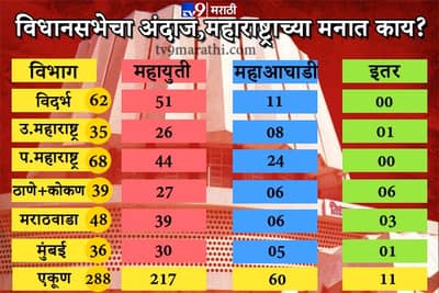 महाराष्ट्रातील 288 विधानसभा मतदारसंघाचा आढावा घेऊन, टीव्ही 9 मराठीने महाराष्ट्राच्या मनात काय हे जाणून घेण्याचा प्रयत्न केला. त्यानुसार विधानसभा निवडणुकीत पुन्हा एकदा भाजप-शिवसेना युतीचीच लाट दिसत आहे. आज निवडणूक झाल्यास महाराष्ट्रात पुन्हा भाजप-शिवसेना युतीचीच सत्ता येण्याचा अंदाज आहे. महाराष्ट्रातील विधानसभेच्या 288 पैकी 217 जागा भाजप-शिवसेना युतीला मिळण्याचा अंदाज आहे. तर काँग्रेस-राष्ट्रवादीला केवळ 60 आणि अपक्ष/इतर पक्षांना 11 जागा मिळण्याचे संकेत आहेत.