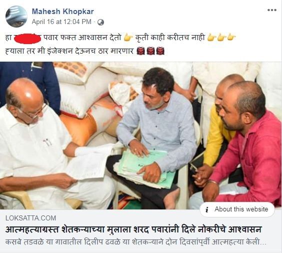 महेश खोपकर या व्यक्तीने 16 एप्रिल रोजी दुपारी 12.04 वाजता स्वत:च्या फेसबुक अकाऊंटवर राष्ट्रवादी काँग्रेस पक्षाचे राष्ट्रीय अध्यक्ष आणि माजी केंद्रीय कृषिमंत्री शरद पवार यांना धमकी देणारी पोस्ट टाकली. “इंजेक्शन देऊनच ठार मारणार”, असे महेश खोपकरने फेसबुक पोस्टमध्ये लिहिले होते. शिवाय, शरद पवारांना उद्देशून महेश खोपकरने आक्षेपार्ह शब्दही वापरले.