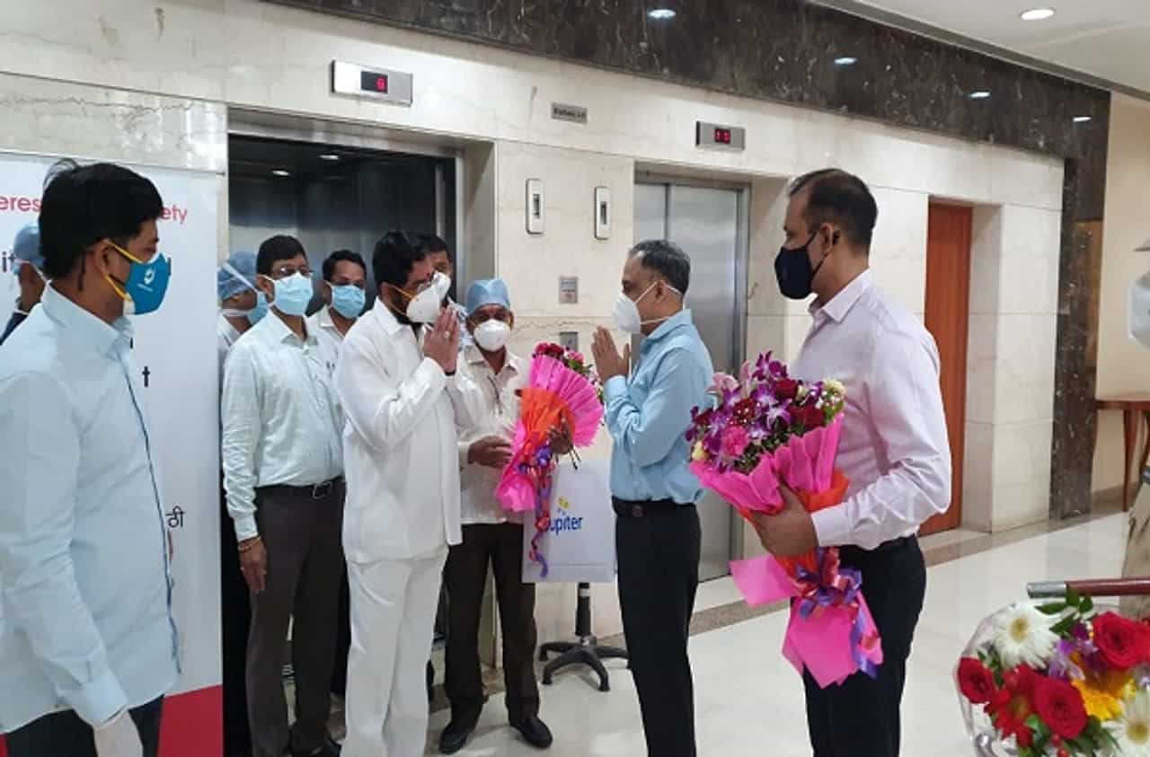 मुंबई : राज्याचे नगरविकास मंत्री एकनाथ शिंदे कोरोनामुक्त झाले असून त्यांना रुग्णालयातून डिस्चार्ज देण्यात आला आहे. एकनाथ शिंदे कोरोनामु्क्त झाल्यानंतर खासदार श्रीकांत शिंदे, पोलीस आयुक्त विवेक फणसाळकर, इतर पोलीस अधिकारी, शिवसेना पदाधिकाऱ्यांनी त्यांची भेट घेतली. रुग्णालयातून डिस्चार्ज मिळाल्यानंतर ते मुलासोबत घरी गेले. (Eknath Shinde cure from Corona)