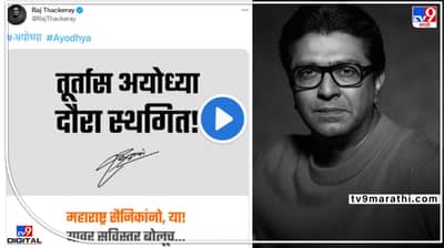 मुंबई : मनसे अध्यक्ष राज ठाकरे यांनी आपला अयोध्या दौरा (Raj Thackeray Ayodhya Tour) स्थगित केला आहे. तूर्तास हा दौरा स्थगित केला असल्याची घोषणा राज ठाकरेंनी सोशल मीडियावर पोस्ट करत दिली आहे. 5 जून रोजी राज ठाकरेंचा अयोध्या दौरा होणार होता. हा दौरा तूर्तास स्थगित करण्यात आला आहे. 22 मे रोजी पुण्यात होणाऱ्या सभेत राज ठाकरे आपल्या अयोध्या दौऱ्याबाबत सविस्तर भूमिका मांडणार आहेत. 5 जून रोजी होणारा राज ठाकरे (Raj Thackeray News) यांचा अयोध्या दौरा तूर्तास स्थगित होण्याची शक्यता टीव्ही 9 मराठीच्या विश्वसनीय सूत्रांनी वर्तवली होती. त्यानंतर राज ठाकरे यांनी शुक्रवारी सकाळी ठीक दहा वाजता याबाबत ट्वीट (Raj Thackeray Tweet) केलंय. अयोध्या दौरा स्थगित करत असल्याची अधिकृत घोषणा राज ठाकरे यांनी केली. आता पुण्यात 22 मे रोजी राज ठाकरेंची सभा होणार आहे. या सभेची जय्यत तयारी पुण्यात मनसैनिकांकडून करण्यात येतेय. या सभेमध्ये राज ठाकरे आपल्या अयोध्या दौऱ्याबाबत सविस्तर भूमिका मांडणार आहेत.