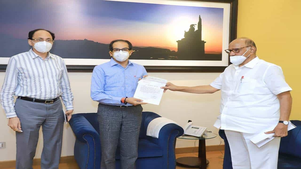 मुंबई : राष्ट्रवादी काँग्रेसचे अध्यक्ष शरद पवार (Sharad Pawar) यांनी आज मुख्यमंत्री उद्धव ठाकरे (CM Uddhav Thackeray) यांची भेट घेतली. मुख्यमंत्र्यांचं निवासस्थान वर्षा या ठिकाणी ही भेट झाली. दोन्ही नेत्यांमध्ये जवळपास तासभर बैठक झाली. यावेळी शरद पवार यांनी रयत शिक्षण संस्थेच्या वतीनं 2 कोटी 36 लाखांचा धनादेश मुख्यमंत्री सहायता निधीला मुख्यमंत्र्यांकडे सुपूर्द केला.