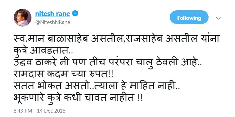 आमदार नितेश राणे यांनी याच महिन्यात 14 आणि 15 डिसेंबर अशा दोन दिवसात रामदास कदम यांना उद्देशून ट्वीट केले होते. त्या ट्वीटमध्ये नितेश राणे यांनी रामदास कदम यांचा ‘कुत्रा’ असा उल्लेख केला होता.