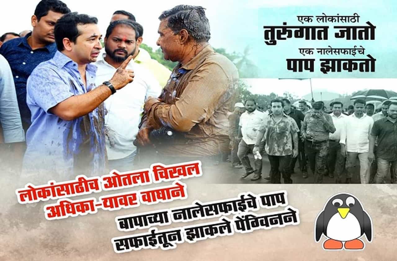 राणे समर्थकांनी सोशल मीडियावर शेअर केलेल्या पोस्टरमध्ये नितेश राणेंची तुलना वाघाशी करत ते लोकांसाठी तुरुंगात गेल्याचं म्हटलं आहे. तसेच युवासेनेचे प्रमुख आदित्य ठाकरे मात्र नालेसफाईतील भ्रष्टाचाराचं पाप झाकत असल्याचा आरोप केला आहे. राणे समर्थकांनी या पोस्टरला दोन कॅप्शन दिले आहेत. एकात म्हटलं आहे, “लोकांसाठीच ओतला चिखल अधिकाऱ्यावर वाघानं, बापाच्या नालेसफाईचं पाप सफाईतून झाकलं पेंग्विननं”. तर दुसऱ्या कॅप्शनमध्ये म्हटलं आहे, “एक लोकांसाठी तुरुंगात जातो, एक नालेसफाईचं पाप झाकतो”.