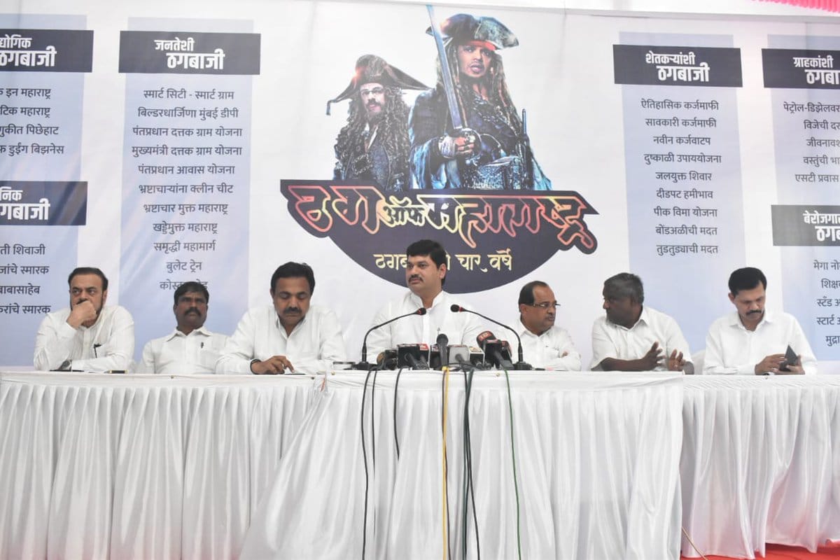 ठग्स ऑफ हिंदोस्तान सिनेमातील अभिनेता आमिर खानच्या जागी देवेंद्र फडणवीस आणि अमिताभ बच्चन यांच्या जागी उद्धव ठाकरे यांचे फोटो लावले आहेत. विधिमंडळाचे हिवाळी अधिवेशन उद्यापासून सुरु होणार आहे. अधिवेशनापूर्वी सरकारविरोधात रणनिती आखण्यासाठी विरोधी पक्षातील गटनेत्यांची बैठक विधानसभेचे विरोधी पक्ष नेते राधाकृष्ण विखे पाटील यांच्या निवासस्थानी झाली. या बैठकीनंतर विरोधकांची संयुक्त पत्रकार परिषदही झाली.
