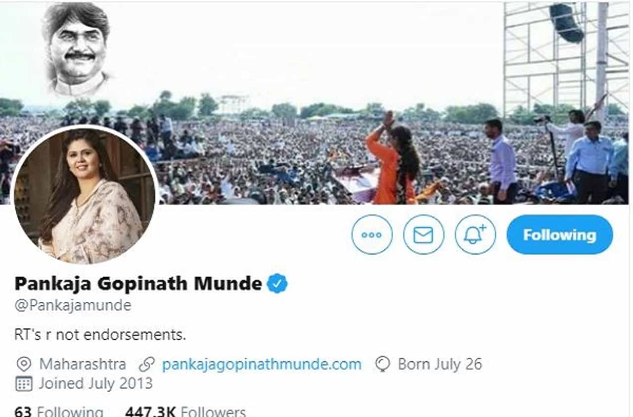 एकीकडे ही फेसबुक पोस्ट तर दुसरीकडे पंकजा मुंडेंच्या ट्विटर हॅण्डलवरुन भाजप गायब असं चित्र आहे. पंकजांनी आपल्या ट्विटर हॅण्डलमध्ये कुठेही भाजपचा उल्लेख केलेला नाही. यापूर्वी पंकजांच्या ट्विटर प्रोफाईलध्ये मंत्रिपदाचा उल्लेख होता. मात्र विधानसभा निवडणुकीतील पराभवानंतर तो हटवण्यात आला. आता त्यांच्या प्रोफाईलवर भाजपबाबत कोणताही उल्लेख नाही. ट्विटर अकाऊंटच्या कव्हरपेजला जनतेला नमस्कार करणारा पंकजांचा फोटो आणि स्वर्गीय गोपीनाथ मुंडे यांचा फोटो आहे.