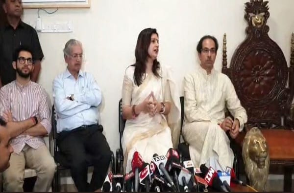 या पत्रकार परिषदेत युवासेना नेते आदित्य ठाकरे यांनी प्रियांका यांच्या हातात शिवबंधन बांधले. शिवबंधन बांधल्यानंतर प्रियांका यांनी मुंबईची गर्जना शिवसेना, महाराष्ट्राची गर्जना शिवसेना अशी चक्क मराठी भाषेतून घोषणा केली.