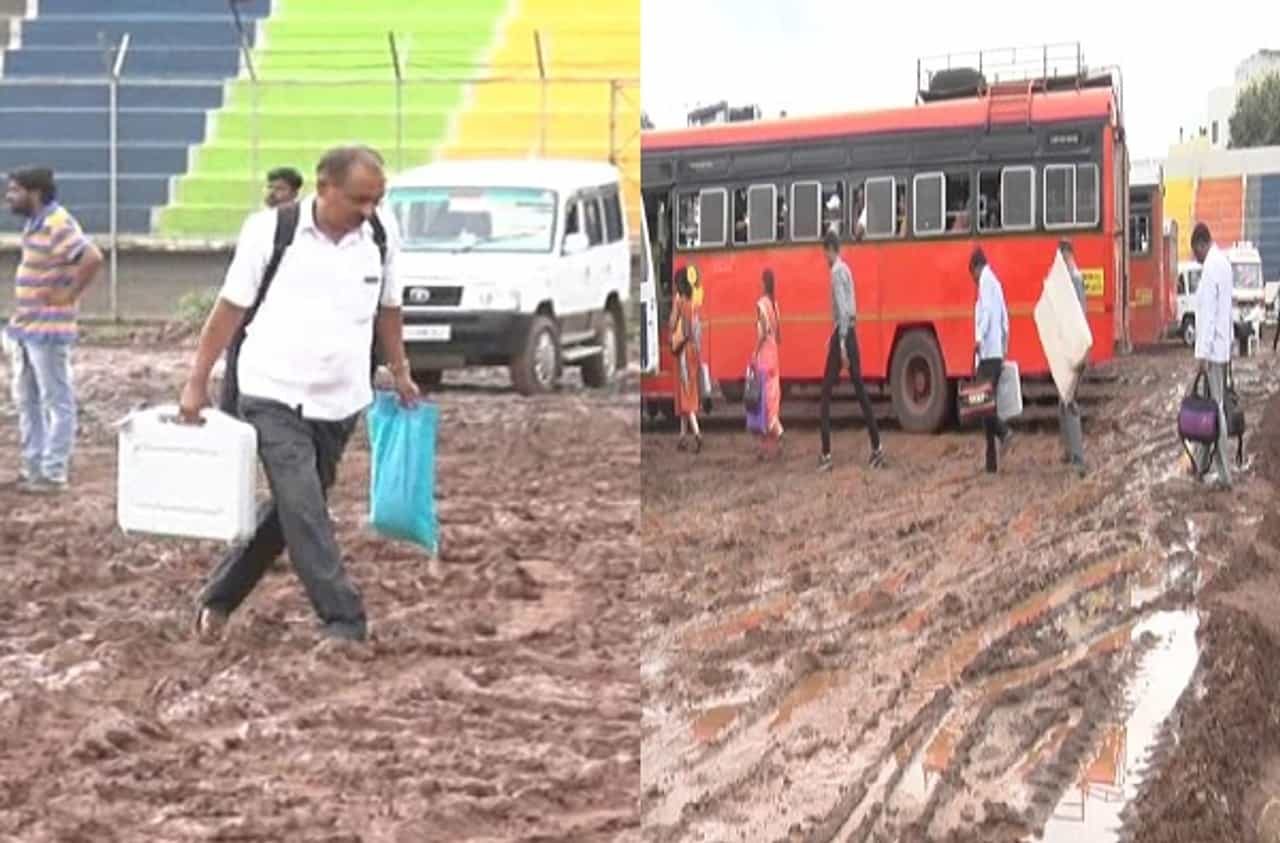 पावसामुळे निवडणूक कर्मचारी हैरान, मतदान केंद्रापर्यंत पोहोचण्यासाठी कर्मचाऱ्यांची तारेवरची कसरत