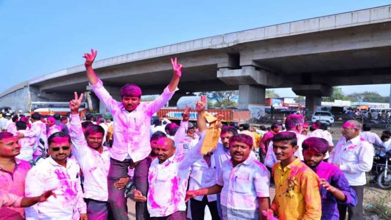 महाराष्ट्र ग्रामपंचायत निकाल 2021 : भिवंडीतील ‘या’ ग्रामपंचायतीवर राष्ट्रवादीची एकहाती सत्ता, JCB मधून उधळला गुलाल