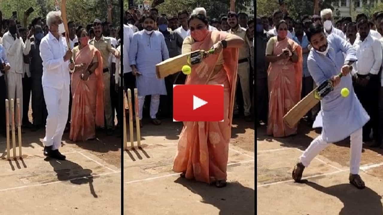सांगली : महाविकास आघाडीतील मंत्री राजकीय मैदानात तुफान फटकेबाजी करताना सर्वांनीच पाहिलं आहे. मात्र दोन पक्षांतील तीन मंत्र्यांना एकाच मैदानावर क्रिकेट खेळताना पाहण्याचा योग सांगलीवासियांना आला. काँग्रेसच्या फायरब्रँड नेत्या यशोमती ठाकूर, युवा नेते विश्वजीत कदम आणि शिवसेनेचे ‘दादा’ नेते दादा भुसे यांनी सॉल्लिड फटकेबाजी केली. (Sangli Minister Dada Bhuse Yashomati Thakur Vishwajeet Kadam Cricket)
