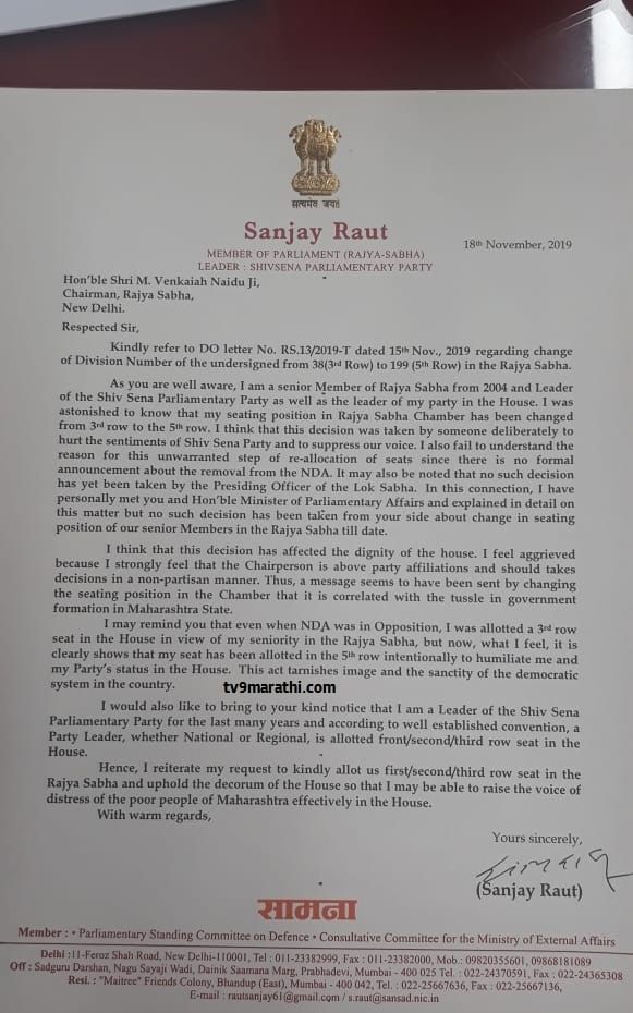 राज्यसभा सदनातील माझी बसण्याची जागा तिसऱ्या रांगेतून पाचव्या रांगेत बदलल्याचं पाहून मी आश्चर्यचकित झालो. शिवसेनेच्या भावना दुखावण्यासाठी आणि आमचा आवाज दडपण्यासाठी जाणीवपूर्वक हा निर्णय एखाद्याने घेतला आहे, असा आरोप संजय राऊत यांनी नायडूंना लिहिलेल्या पत्रात केला आहे.