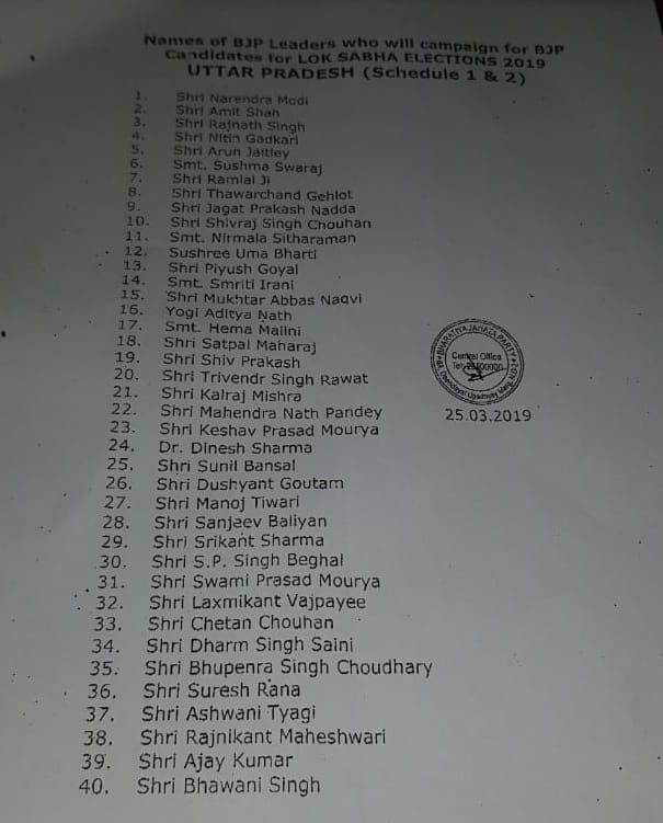 दरम्यान, समाजवादी पक्षानेही अशाचप्रकारे आपली स्टार प्रचारकांची यादी जाहीर केली होती. मात्र, त्यात सपाचे ज्येष्ठ नेते मुलायम सिंह यांच्याच नावाचा समावेश नसल्याने बराच गदारोळ झाला. यानंतर सपाने आपली स्टार प्रचारकांची यादी अद्ययावत करत मुलायम सिंह यादव यांचे नाव यादीत समाविष्ट केले. मुलायम सिंह मैनपुरी मतदार संघातून लोकसभा निवडणूक लढवत आहेत.
