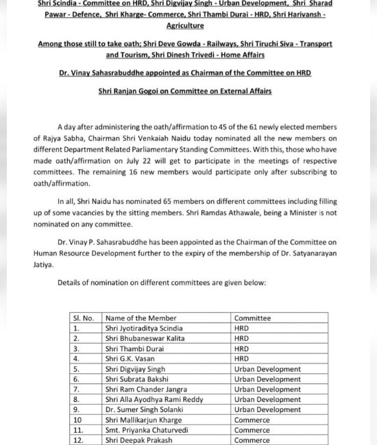 A day after administering the oath to 45 of 61 newly elected members of Rajya Sabha, Chairman Venkaiah Naidu today nominated all new members to different Department related Parliamentary Standing Committees. Jyotiraditya Scindia gets Human Resource Development (HRD) Department.