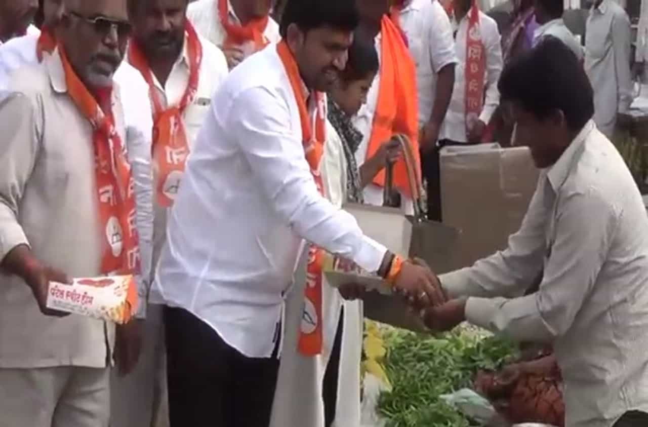 बीड : मुख्यमंत्री उद्धव ठाकरे यांनी काल (21 डिसेंबर) हिवाळी अधिवेशनात कर्जमाफीची घोषणा (Shivsena farmer loan waiver announcement) केली. या घोषणेनंतर शेतकऱ्यांनी समाधान व्यक्त केलं आहे. ठाकरे सरकारने शेतकऱ्यांसाठी घेतलेल्या पहिल्याच निर्णयाचं बीड जिल्ह्यात शिवसेनेकडून जंगी स्वागत करण्यात आले आहे. आज (22 डिसेंबर) आठवडी बाजाराचे (Shivsena farmer loan waiver announcement) निमित्त साधून शिवसेना जिल्हाप्रमुख कुंडलिक खांडे यांनी बाजारातील शेतकऱ्यांना तब्बल 100 किलो पेढे वाटून सरकारच्या निर्णयाचे अनोखे स्वागत केले.