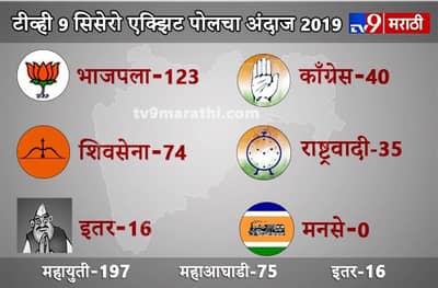 एक्झिट पोलनुसार, भाजपला 123, शिवसेनेला 74, काँग्रेस 40, राष्ट्रवादी 35, मनसे 0 आणि इतरांना 16 जागांचा अंदाज आहे. म्हणजेच महायुतीला 197 तर महाआघाडीला 75 आणि इतरांना 16 जागा मिळतील असा अंदाज आहे.