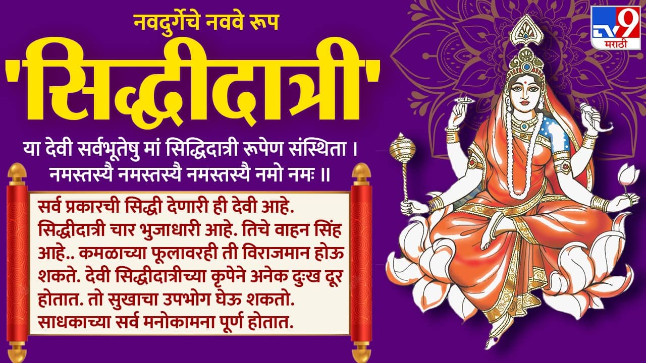 भगवान शंकराने सिद्धीदात्री हिच्याच कृपेने सर्व सिद्धी प्राप्त केल्या होत्या. सर्व प्रकारची सिद्धी देणारी ही देवी आहे. नवव्या दिवशी जांभळ्या रंगाची वस्त्रे परिधान केली जातात. जांभळ्या रंगाला सुंदर असा मखमालीचा भाव आहे.