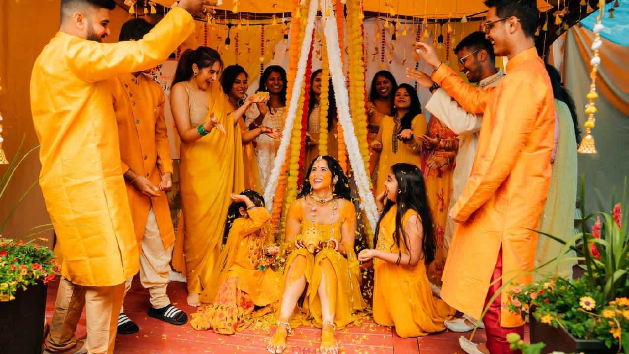 हळदीच्या कार्यक्रमात सहभागी होणारे लग्न ठरलेल्यांना हळद लावून आशिर्वाद देतात.