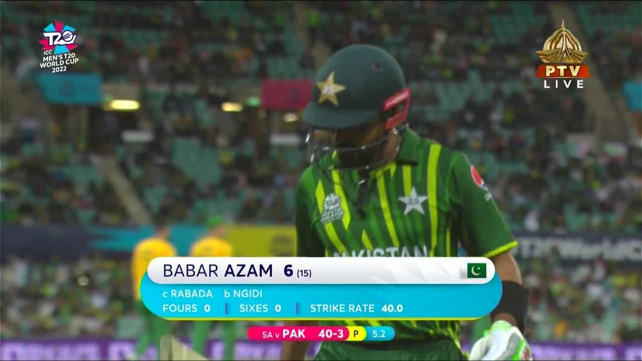 काही चेंडू खेळल्यानंतर पाकचा कर्णधार बाबर आझम याने उत्तुंग फटका मारण्याचा प्रयत्न केला. परंतु त्याचा तो प्रयत्न फसला, आणि तो बाद झाला. ज्यावेळी चेंडू हवेत गेला त्यावेळी त्याचा अंदाज आफ्रिकेचा गोलंदाज रबाडा झेल मारुन पकडला. ज्यावेळी झेल पकडला त्यानंतर रबाडासह टीममधील खेळाडूंनी आनंद साजरा केला.