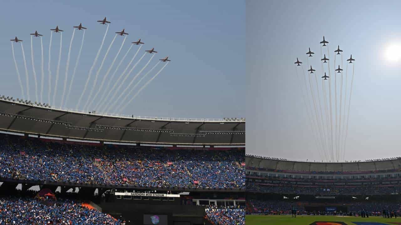 वर्ल्ड कप फायनल सामन्यासाठी वायुसेनेकडून 15 मिनिटे सलामी देण्यात आली. यावेळी नरेंद्र मोदी स्टेडियममध्ये उत्साह पाहायला मिळाला.