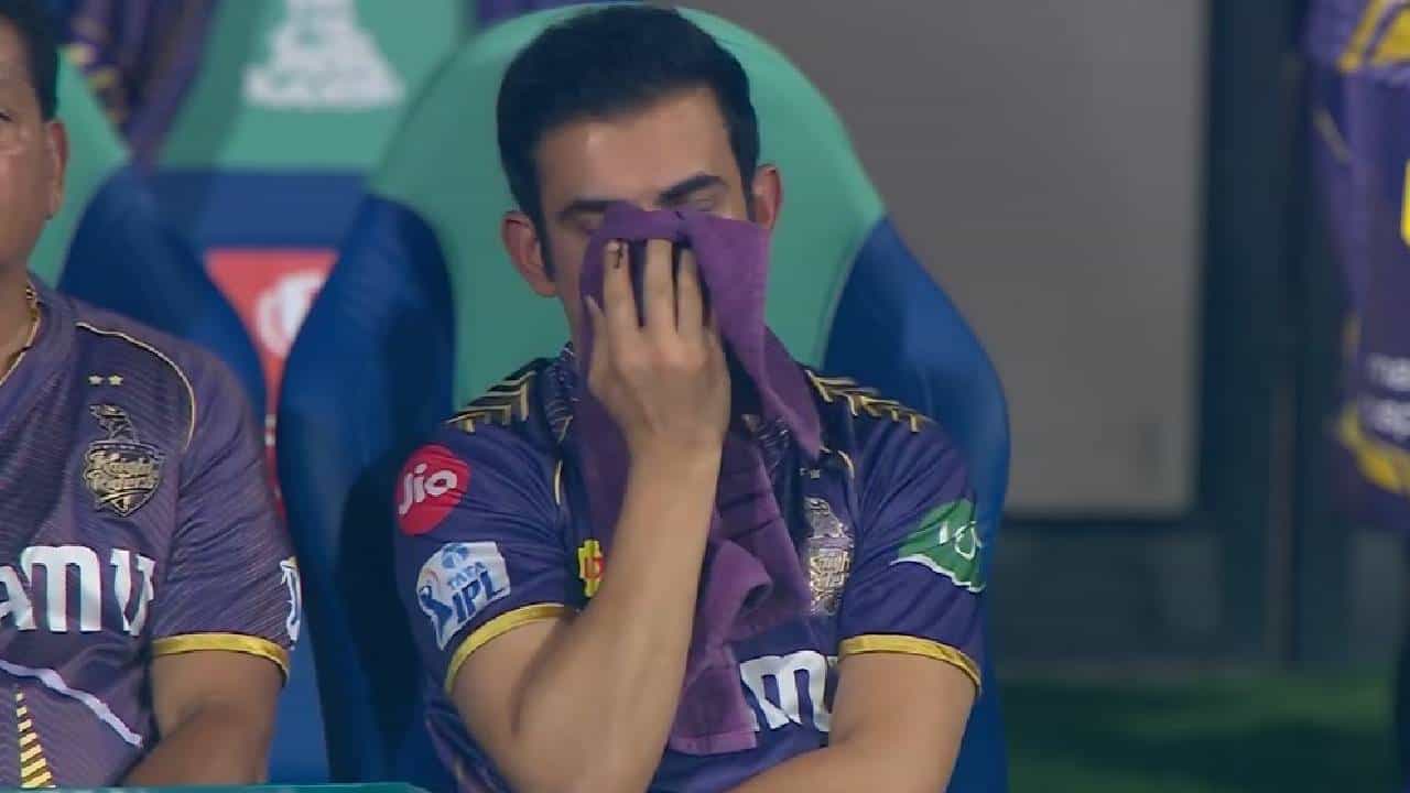 आयपीएल 2024 स्पर्धेतील जेतेपदासाठी सनरायझर्स हैदराबाद आणि कोलकाता नाईट रायडर्स यांच्यात लढत सुरु आहे. या सामन्यात नाणेफेकीचा कौल सनरायझर्स हैदराबादच्या बाजूने लागला. हैदराबादने प्रथम फलंदाजी करण्याचा निर्णय घेतला. पण सुरुवात हवी तशी झाली नाही. आघाडीचे फलंदाज झटपट बाद झाले त्यामुळे हैदराबादचा संघ बॅकफूटवर गेला. अभिषेक शर्मा आणि ट्रेव्हिस हेड झटपट बाद झाले. मिचेल स्टार्कची धास्ती हैदराबादच्या फलंदाजांनी घेतल्याचं स्पष्ट दिसून आलं. हेडने तर नॉन स्ट्राईकला राहणं पसंत केलं. इतकं सर्व व्यवस्थित होत असताना कोलकाता नाईट रायडर्सचा मेंटॉर गौतम गंभीरची एक क्षण धाकधूक वाढली. श्रेयस अय्यरने संघाचं पाचवं आणि वैयक्तिक तिसरं षटक मिचेल स्टार्कला सोपवलं. या षटकाच्या दुसऱ्या चेंडूवर राहुल त्रिपाठीने उत्तुंग फटका मारण्याचा प्रयत्न केला. पण बॅटला कट लागल्याने चेंडू खूपच वर चढला. एवढ्या वर चढलेला चेंडू झेल होईल की नाही अशी शंका प्रत्येकाच्या मनात होती. यातून गौतम गंभीरही सुटला नाही. कारण चेंडू जज करत त्याच्या रमणदीप सिंग आला होता. आात झेल पकडणार की नाही अशी चलबिचल सुरु होती. हा क्षण डोळ्यात साठवणं गौतम गंभीरलाही कठीण गेलं. त्याने तर हातात असलेल्या नॅपकिनने चेहरा झाकला.