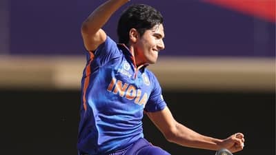राज बावाने त्याच्या चौथ्या षटकाच्या शेवटच्या दोन चेंडूंवर विकेट घेतल्या. राज बावाला हॅट्ट्रिक घेता आली नाही. पण लगेचच त्याने चौथा विकेटही घेतला. राज बावाने शॉर्ट पीच बॉल्सवर इंग्लंडच्या फलंदाजांना लक्ष्य केलं. त्यामुळे एकवेळ इंग्लंडची सहाबाद 61 अशी स्थिती होती. त्याआधी सुद्धा राज बावाने दक्षिण आफ्रिकेविरुद्ध चार विकेट घेतल्या होत्या. (Photo: Twitter/BCCI)