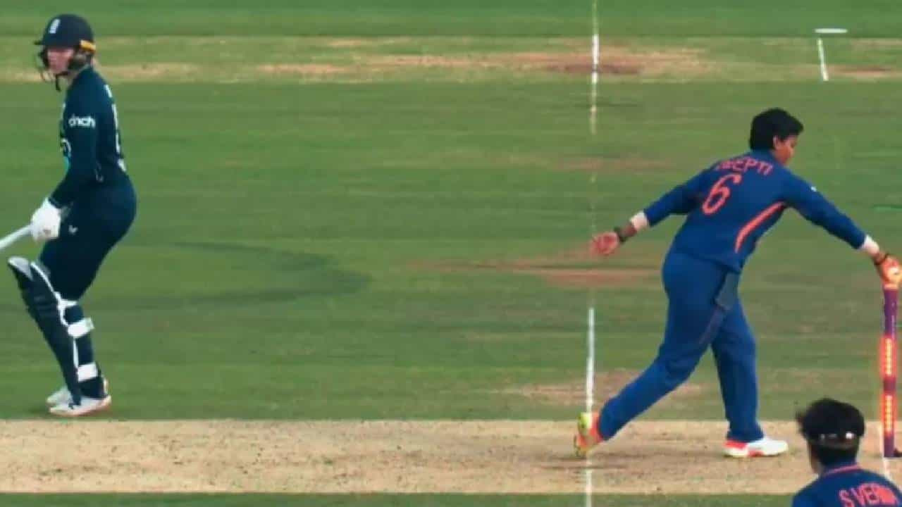 44 व्या ओव्हरमध्ये दीप्ती चौथा चेंडू टाकण्यासाठी स्टम्पसजवळ पोहोचली. त्यावेळी नॉन स्ट्राइक एन्डवरुन चार्ली डीनने क्रीज सोडला होता. ती क्रीजच्या पुढे निघून गेली होती. दीप्तीने लगेच आपला रन-अप थांबवून बेल्स उडवल्या. डीनला तिने रनआऊट केलं.
