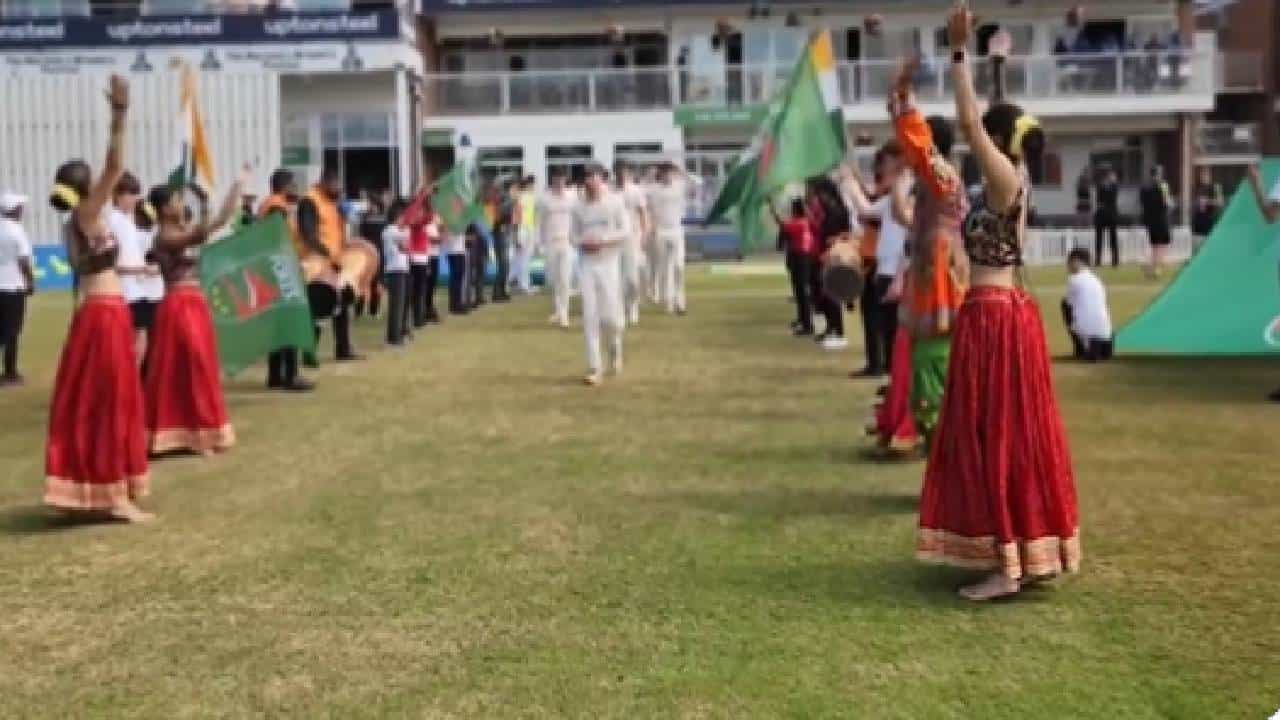 मुंबई: एक जुलैपासून सुरु होणाऱ्या कसोटी सामन्याआधी भारत आणि लीसेस्टरशायर (India vs Leicestershire) मध्ये आज पासून चार दिवसीय सराव सामन्याला सुरुवात झाली आहे. भारताचा कॅप्टन रोहित शर्माने (Rohit Sharma) टॉस जिंकून प्रथम फलंदाजीचा निर्णय घेतला आहे. इंग्लंडमध्ये दाखल झाल्यानंतर पहिली वॉर्म अप मॅच (Warm up Match) खेळणाऱ्या टीम इंडियाचं देशी अंदाजात जोरदार स्वागत करण्यात आलं. ढोल-नगाडे वाजवून पंजाबी स्टाइलने स्वागत करण्यात आलं. भारतीय संस्कृतीनुसार, कलाकारांनी डान्स करुन स्वागत केलं. बीसीसीआयने हा व्हिडिओ आपल्या सोशल मीडियावर पोस्ट केला आहे. कलाकारांनी भारतीय वेशभूषा परिधान करुन नृत्य केलं. जल्लोषात भारतीय खेळाडूंच स्वागत केलं.