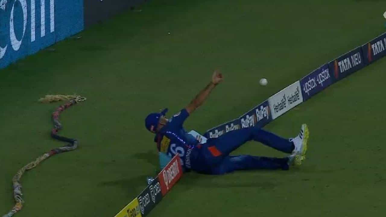 पॉवर प्लेच्या शेवटच्या षटकाच्या पाचव्या चेंडूवर रोहित शर्माने यश ठाकुरला पुल शॉट मारला. हा चेंडू रवि विश्नोईच्या हातात बसला. पण सिक्सवर तोल गेल्याने तो सीमारेषेवर पडला. त्यामुळे आऊट होण्याऐवजी सिक्स गेला. यामुळे लखनऊच्या डगआऊटमध्ये बसलेल्या खेळाडूंनी डोक्यावर हात मारला. हा षटकार कदाचित शेवटच्या षटकात महागात पडू शकतो.