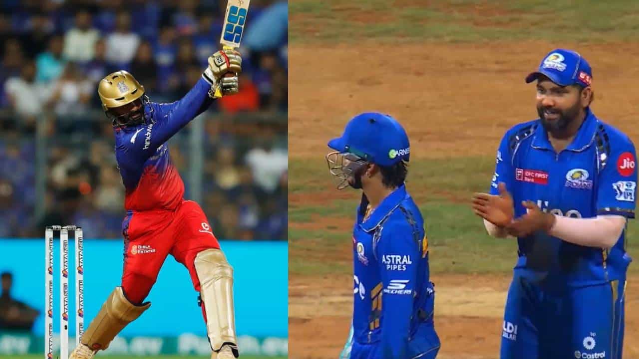 रॉयल चॅलेंजर्स बंगळुरु आणि मुंबई इंडियन्स यांच्यात मुंबईच्या वानखेडे मैदानावर सामना रंगला. या सामन्यात रॉयल चॅलेंजर्स बंगळुरुने 20 षटकात 8 गडी गमवून 196 धावा केल्या आणि विजयासाठी 197 धावांचं आव्हान दिलं. या सामन्यात आरसीबीच्या दिनेश कार्तिकने जबरदस्त खेळी केली. 23 चेंडूत 53 धावा केल्या. त्याची वादळी खेळी पाहून रोहित शर्मा जवळ गेला आणि...