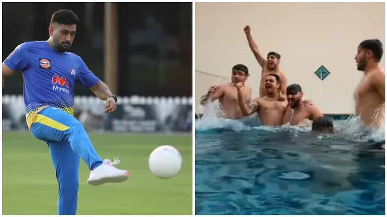 (MS dhonis csk team playing football and mumbai indians players enjoying volleyball at pool see video)